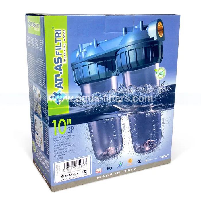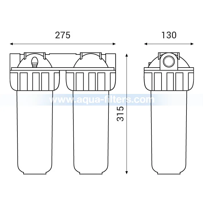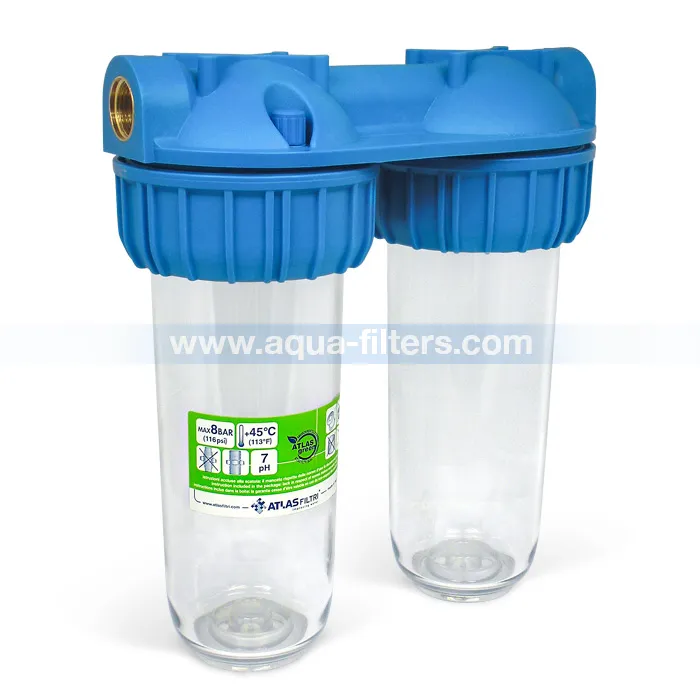 Двоен корпус за филтър. Съвместим е с филтърни патрони с размер 10". В главата на корпуса има клапан за обезвъздушаване. Корпусите са за битово или индустриално приложение. В домакинството най-често се монтират директно след водомера или преди уред, изискващ филтриране на водата.