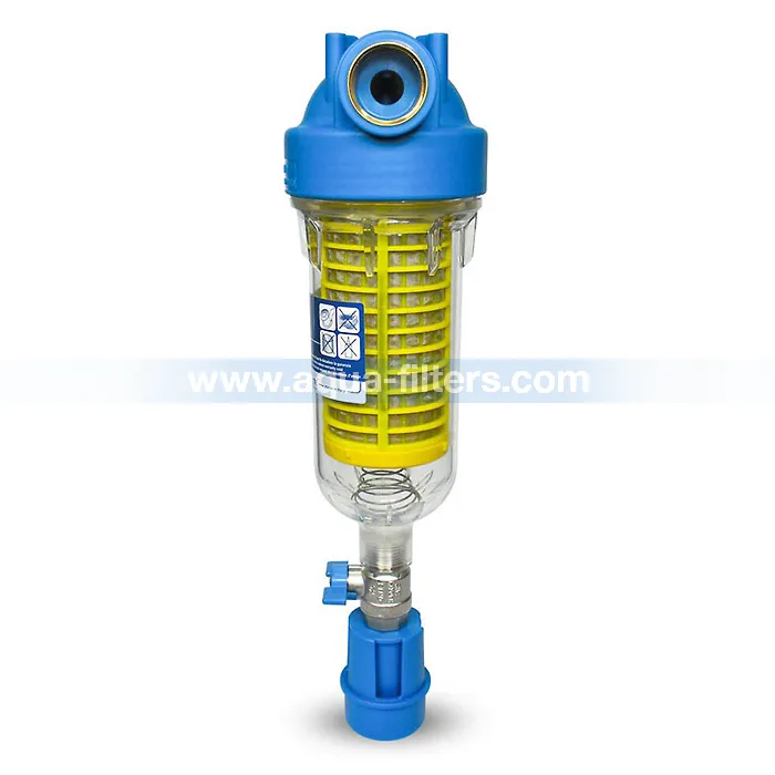 За да се почисти филтърния елемент няма нужда от разглобяване или спиране на водата. Само за кратко отворете дренажния кран в долната му част.