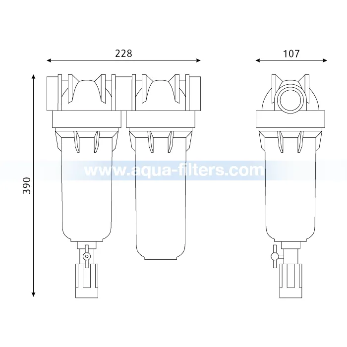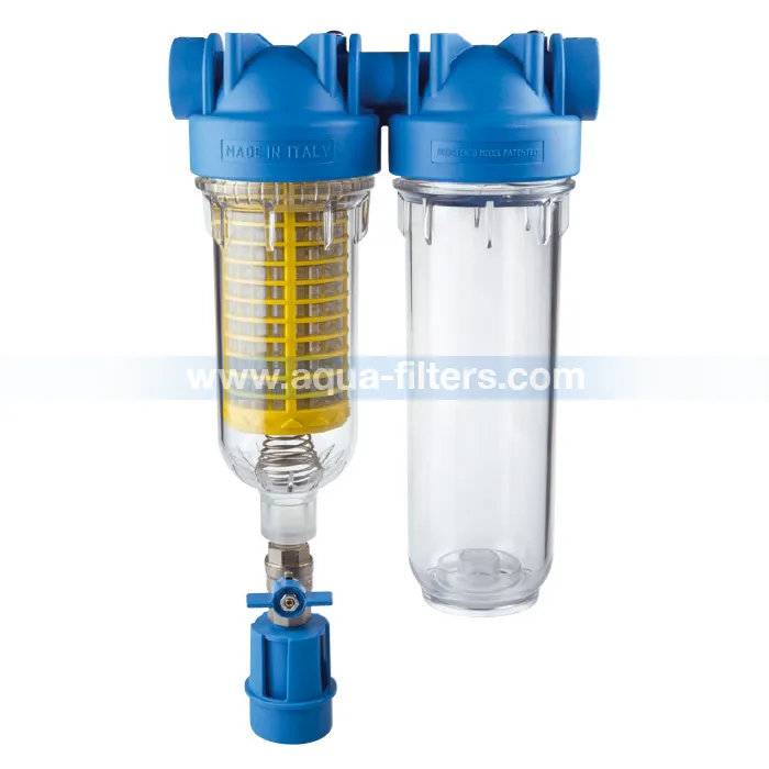 Двоен филтър за вода, подходящ за монтаж след водомера. Първата секция на филтъра представлява самопочистващ филтър Hydra, който е оборудван с неръждаем филтърен патрон и се свързва към канал. При необходимост от почистване се отваря дренажния кран в долната част на филтъра и всичките задържани песъчинки се изхвърлят в канализацията.На този етап водата се очиства от механични примеси с размер до 90 микрона – песъчинки, ръжда и т.н.