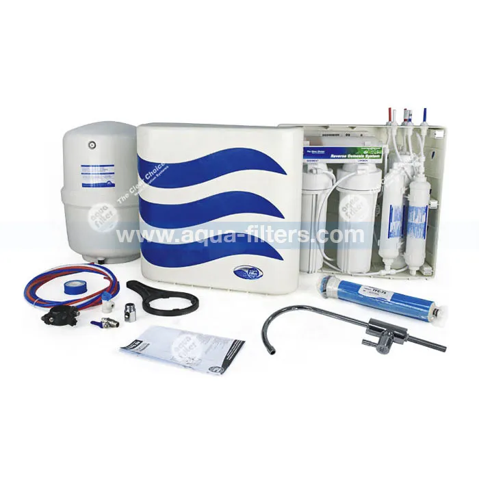 3. Обратна осмоза. Осмотичната мембрана е основния елемент в системата. Тя е с големина на порите от 0,001 микрона, малко по-големи от водната молекула. Затова през мембраната на практика преминава само вода. Всички разтворени във водата вредни вещества, като - тежки метали, вируси, бактерии, радиоактивни и канцерогенни елементи, просто се изхвърлят в канализацията. На този етап филтрацията протича бавно и това налага събирането на вече филтрираната вода в буферен съд. Използваната осмотична мембрана е TFC-75F. Тя има производителност 75 галона на денонощие (около 11 литра/час).