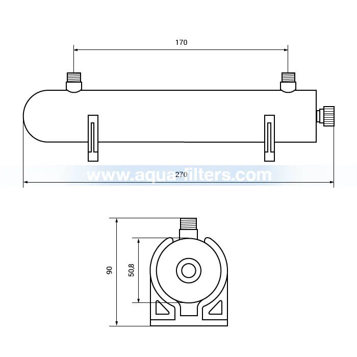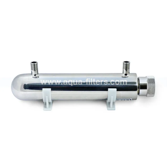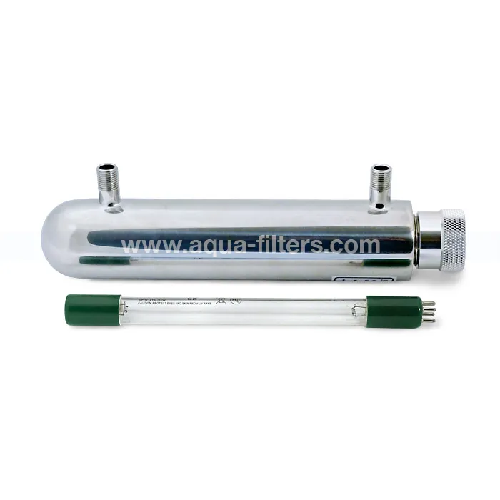UV лампа за микробиологично пречистване на вода с дебит до 240 литра/час. Корпусът е изработен от полирана неръждаема стомана, а присъединителният размер е 1/4”. За битови или промишлени цели. UV стерилизаторът може да бъде използван във филтриращи системи за вода, в системи за обратна осмоза, за машини за пречистване на вода, за лабораторни нужди и т.н.