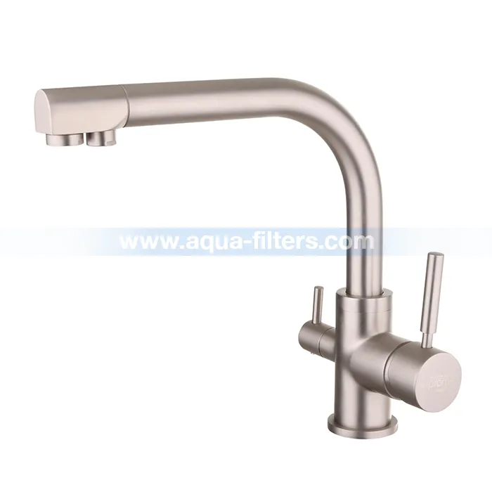 Стилен и удобен кухненски смесител за топла, студена и филтрирана вода. Благодарение на него отпада необходимостта от монтиране на допълнителна батерия (кран) за филтрирана вода, каквато често се продава с филтърните системи. Смесителят е с модерно матово покритие, което лесно се поддържа и по което не остават следи от отпечатъци. В смесителя са използвани качествени керамични глави, които имат голям срок на експлоатация.